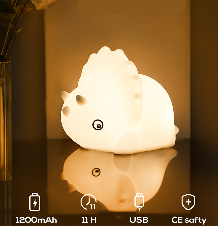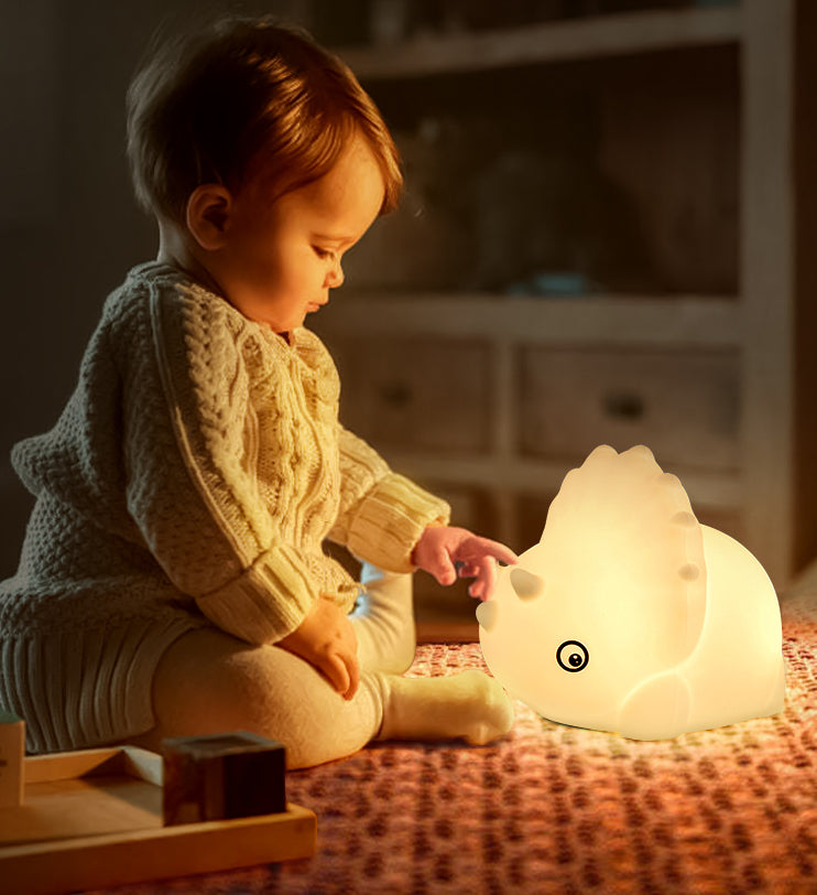 Låt din lilla upptäcktsresande sova gott med vår bedårande nattlampa dinosaurie i silikon med touch! Denna charmiga triceratops är inte bara en söt inredningsdetalj utan också en praktisk ljuskälla som skapar en trygg och lugn atmosfär i barnrummet. Tillverkad av mjukt, BPA-fritt silikon är den säker för barn att röra vid och leka med. Med sin enkla touchfunktion kan ditt barn själv enkelt tända, släcka och justera ljusstyrkan, vilket ger en känsla av självständighet och komfort när mörkret faller. Inga fler mörkrädda nätter – bara en mjukt lysande dinosaurie som vakar över drömmarna.