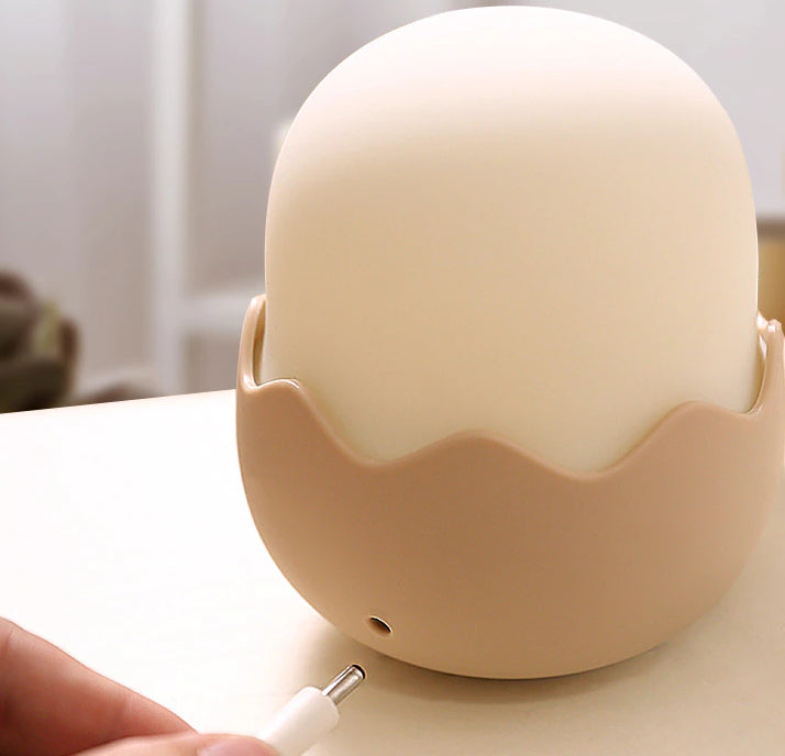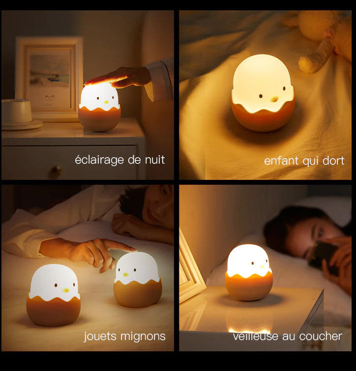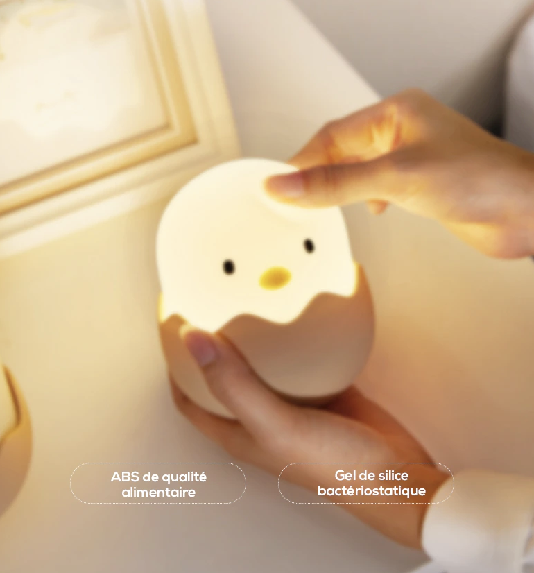 Låt ditt barns drömmar lysa upp med vår förtrollande nattlampa kyckling i silikon för barn! Denna lilla kyckling, som ser ut att just ha kläckts ur sitt ägg, är mer än bara en lampa – den är en trygg och lekfull vän som följer med ditt barn genom natten. Tillverkad av mjukt, klämbart silikon, är den perfekt för små händer att hålla i. Med ett enkelt tryck på huvudet, som bilden visar, kan ditt barn enkelt tända och släcka lampan eller byta mellan olika ljuslägen. Denna charmiga nattlampa skapar en lugnande och varm atmosfär i barnrummet, perfekt för att läsa en godnattsaga eller bara som en mysig detalj.