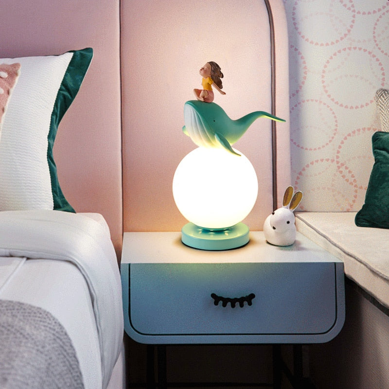 Denna speciella nattlampa är inte bara en källa till ljus, utan också en konstnärlig utsmyckning som fångar ögat och hjärtat. Dess mjuka, varma sken är perfekt för att skapa en avslappnande miljö utan att vara för starkt, vilket är idealiskt för godnattsagor eller som en lugnande närvaro under natten. Den detaljerade designen, med den lekfulla blåvalen och den fridfulla flickan, är tillverkad med omsorg för att garantera både skönhet och hållbarhet. Den är lätt att placera på nattduksbordet, en hylla eller var som helst där du vill addera en touch av magi.
