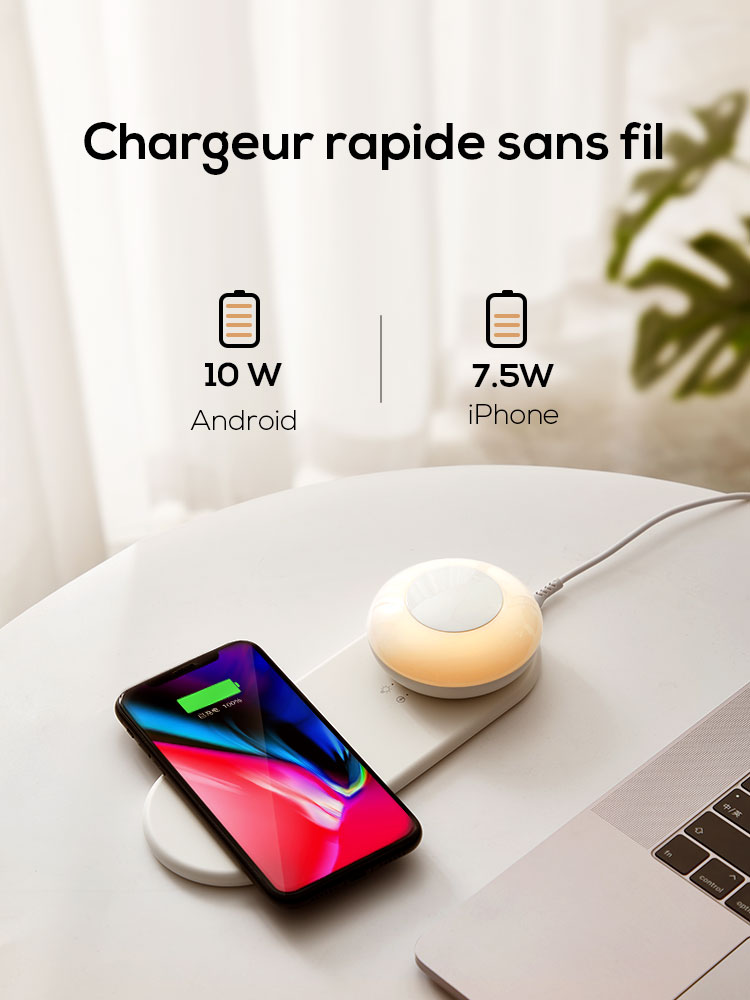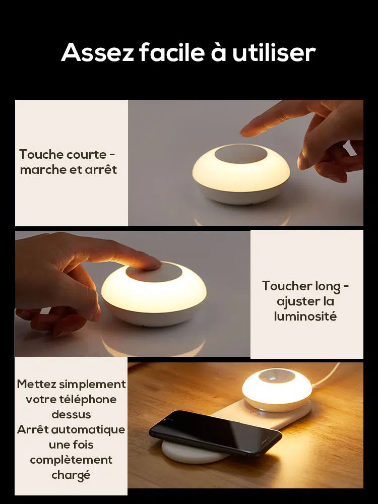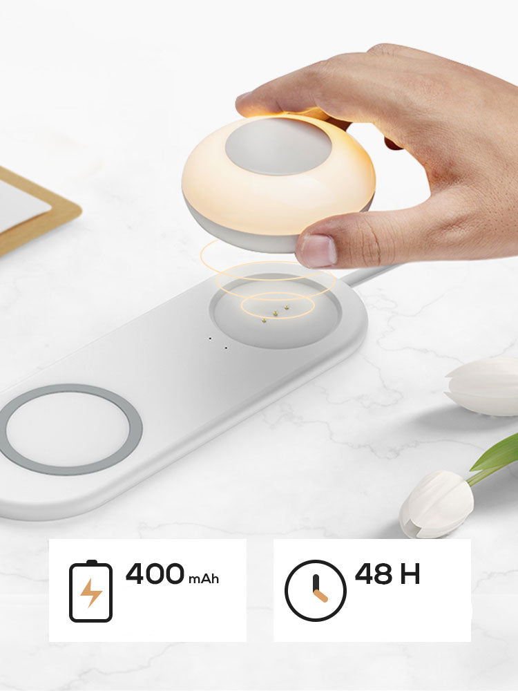 - Trådlös laddningsstation: Laddar både lampan och din smartphone samtidigt.