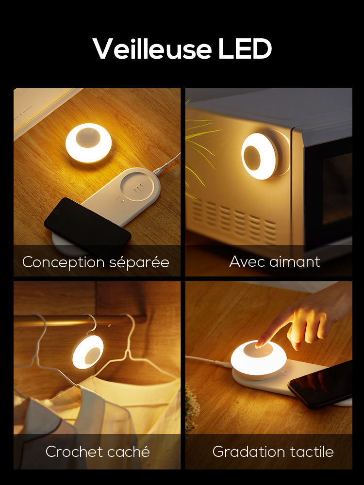Föreställ dig att du smidigt kan navigera i ditt hem under natten utan att famla efter strömbrytaren. Med vår smarta nattlampa med rörelsesensor USB blir detta verklighet. Den här stilrena och kompakta lampan tänds automatiskt när den känner av rörelse, vilket ger dig precis tillräckligt med ljus för att se var du går, utan att störa din nattsömn. Det är den perfekta lösningen för sovrummet, hallen, barnrummet eller där du behöver en diskret ljuskälla. Lampan är enkel att placera och kan till och med laddas trådlöst via den medföljande basstationen, vilken även kan ladda din smartphone – smart, eller hur?